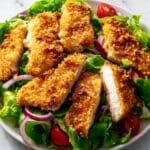 - Add the Chicken: Slice the air-fried chicken tenders into strips and arrange them on top of the prepared salad.