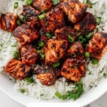 6. Finish and Serve: Transfer the cooked salmon bites to a serving plate. Drizzle the reserved Bang Bang sauce over the top and garnish with finely chopped chives. Serve immediately.