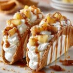 - Garnish and Serve: Optionally drizzle caramel sauce over the filled tacos and sprinkle crushed graham crackers on top for added texture and flavor. Serve immediately to enjoy the perfect contrast between the crispy shells and creamy filling.