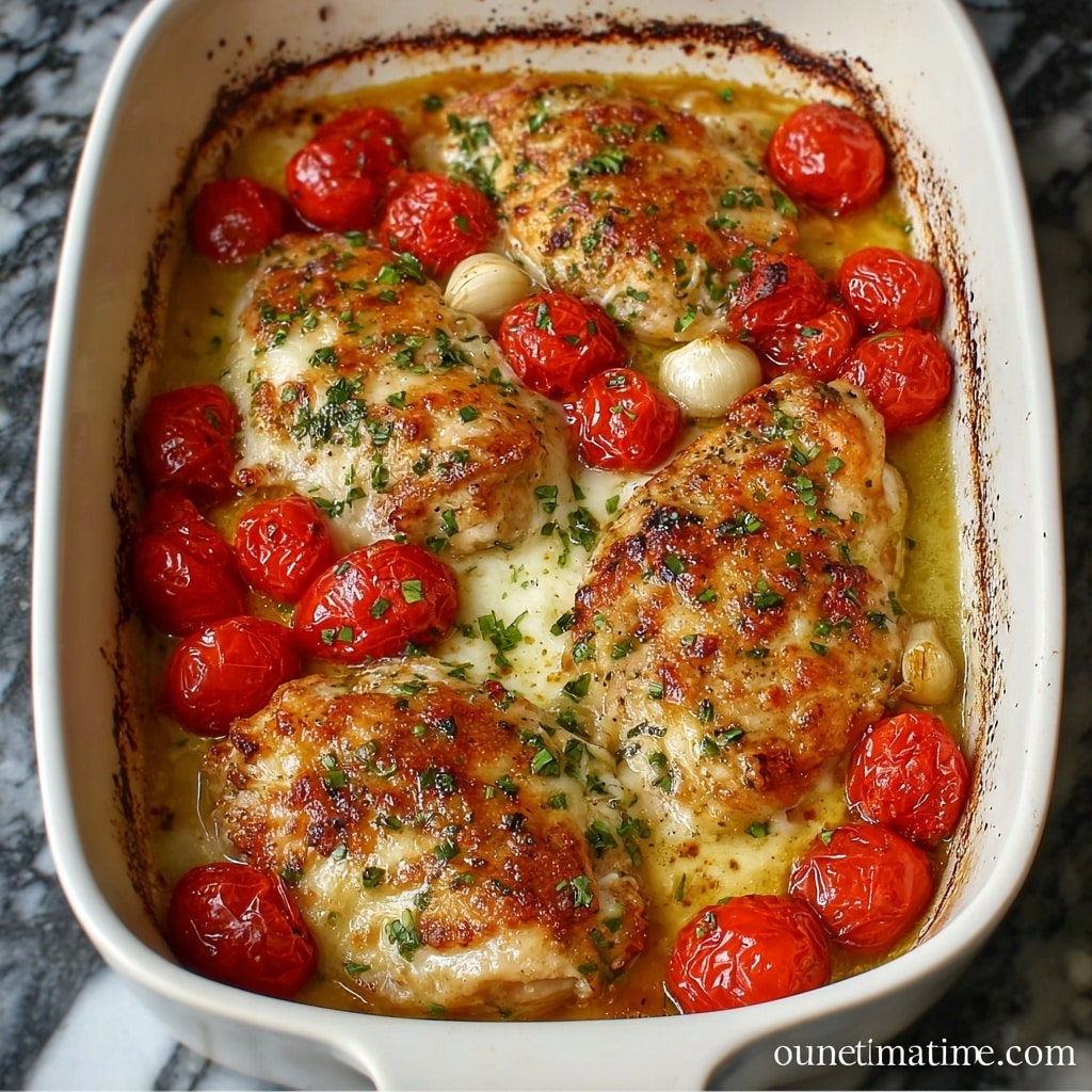 Once out of the oven, scatter halved cherry tomatoes around the chicken and, if you love, sprinkle freshly chopped basil on top for a refreshing herbal note. These bright additions add color, fresh flavor, and a touch of juiciness that elevate the entire dish to another level.