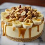 A rich and creamy Banana Caramel Peanut Butter Cheesecake featuring a buttery graham cracker crust, luscious peanut butter-infused cream cheese filling, ripe bananas for natural sweetness, and a decadent caramel topping with optional roasted peanuts for added crunch. This no-fail cheesecake blends classic American dessert flavors into a smooth, indulgent treat perfect for any occasion.