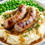 A classic British comfort food recipe featuring savory pork sausages served with a rich onion gravy, accompanied by creamy mashed potatoes and sweet baby peas. This easy-to-make dish combines hearty flavors and textures for a satisfying meal, perfect for any occasion.