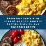 Now it’s the moment to bring everything together. On each plate, arrange a generous helping of scrambled eggs next to the sausage patties and biscuits. Add the bright, seasoned slices of tomato on the side. This colorful spread invites you to dig in and savor every element—from the savory bites to the fresh tomato finish. Your Breakfast Feast with Scrambled Eggs, Sausage Patties, Biscuits, and Tomatoes Recipe is ready to delight your senses.
