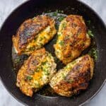 - If you don’t have an oven-safe skillet, sear the chicken in a regular skillet and then transfer the stuffed breasts to a baking dish for the oven step.