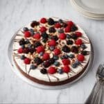 - Assemble the dessert pizza: Evenly spread the creamy vanilla pudding topping over the cooled brownie crust. Arrange the mixed fresh berries on top decoratively, then drizzle chocolate syrup over the fruit and sprinkle with chopped pecans.