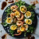 - Assemble the Deviled Eggs: Spoon or pipe the deviled egg filling into the egg whites. Slice the cooked shrimp into bite-sized pieces and place one piece atop each filled egg half. Garnish with fresh chopped parsley and a dash of hot sauce if desired.