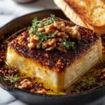 - Garnish and Serve: Sprinkle the toasted walnuts, fresh herbs if using, and cracked black pepper over the caramelized feta. Serve immediately with warm pita, flatbread, or crusty bread for dipping and enjoying.