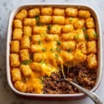 This Cheesy Beef and Tater Tot Casserole is a comforting and hearty dish featuring a savory mixture of ground beef, creamy mushroom soup, sour cream, and melted cheddar cheese, all topped with crispy golden tater tots. Perfect for family dinners, this casserole combines simple ingredients with easy preparation and baking to create a crowd-pleasing meal.