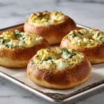 These Cheesy Spinach-Artichoke Bagels combine creamy, savory spinach and artichoke filling with melty mozzarella and Parmesan cheeses on toasted bagel halves. Perfect for a flavorful breakfast or snack, they’re easy to prepare and baked to golden, bubbly perfection.