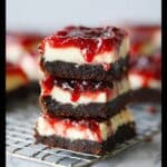 Indulge in these decadent Cherry Chocolate Brownie Cheesecake Bars, featuring a rich fudge brownie base topped with a creamy cheesecake layer, tangy cherry pie filling, and a swirl of chocolate chips for the perfect marbled dessert bar.
