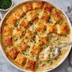 This comforting Chicken and Biscuits casserole combines tender sautéed chicken and vegetables in a creamy thyme-infused sauce, all topped with golden baked biscuits. Perfect for a hearty family meal, this dish is made in one oven-safe skillet, allowing for easy preparation and cleanup. The flaky biscuits bake right atop the savory filling, creating a satisfying mix of textures and flavors.