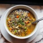 A hearty and comforting Chicken & Wild Rice Soup featuring tender shredded chicken, nutty wild rice, and a medley of sautéed vegetables in a flavorful broth, perfect for a cozy meal.
