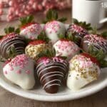 Delightful and romantic chocolate-covered Valentine strawberries featuring ripe fresh strawberries dipped in rich dark chocolate, elegantly drizzled with white chocolate, and adorned with festive heart-shaped sprinkles. Perfect for special occasions or a sweet homemade gift.