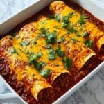 This Classic Beef Enchiladas With Red Sauce recipe is a comforting, flavorful Mexican-inspired dish featuring seasoned ground beef wrapped in soft corn tortillas, topped with a rich red enchilada sauce and melted cheese. Perfect for a family dinner or casual get-together, this recipe balances savory spices with tangy tomato flavors and is garnished with fresh cilantro and sour cream for an authentic touch.