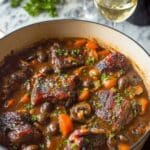 Classic Coq Au Vin is a traditional French dish featuring tender chicken slowly braised with red wine, bacon, mushrooms, and aromatic herbs. This hearty, flavorful stew is perfect for a comforting dinner and showcases rich, deep flavors developed through slow cooking in a Dutch oven.