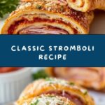 This Classic Stromboli recipe features a golden, crispy crust filled with layers of savory salami, ham, pepperoni, melty mozzarella, and tangy pizza sauce. Perfectly baked and sliced, it offers a delicious combination of Italian-inspired flavors ideal for a satisfying meal or party appetizer.