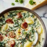 This Copycat Olive Garden Sausage Kale and Potato Soup delivers a rich and comforting blend of savory Italian sausage, tender potatoes, and nutrient-packed kale in a creamy broth. Perfect for a cozy meal, this hearty soup combines classic Italian flavors with a velvety texture, enhanced by crispy bacon and a sprinkle of parmesan cheese.