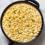 A rich and creamy creamed corn recipe made with fresh or frozen corn, sautéed shallots and garlic, and enriched with heavy cream, milk, and parmesan cheese. This comforting side dish is seasoned with sugar, salt, pepper, and a hint of cayenne for a subtle kick, then finished with chopped parsley for freshness.