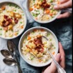 - Serve: Ladle the soup into bowls and garnish with the chopped crispy bacon, homemade mini croutons, and a sprinkle of finely chopped parsley if desired. Serve immediately and enjoy your creamy chicken noodle soup.