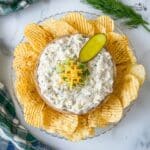 - Garnish and Serve: Before serving, garnish with the reserved 1/3 cup chopped dill pickles, additional fresh dill, or extra cheddar cheese if desired. Serve the dip with kettle potato chips, crackers, or pieces of French bread for dipping.