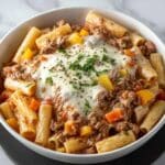 Creamy Rotel Pasta with Ground Beef is a rich and comforting dish featuring tender pasta coated in a luscious sauce made from Rotel tomatoes, cream of mushroom soup, heavy cream, and melted cheddar cheese. Ground beef, sautéed with aromatic onions and garlic, adds a hearty flavor, making this an easy one-pot meal perfect for weeknight dinners.