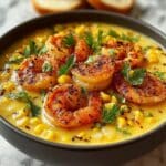 This Shrimp and Corn Bisque is a rich, creamy, and flavorful seafood soup perfect for any occasion. Made by simmering shrimp shells with aromatic vegetables and spices to create a homemade seafood stock, then blended with sweet corn and finished with tender shrimp and cream. This bisque offers a delightful balance of sweet corn and shrimp flavors with a touch of heat from optional spices, resulting in a comforting and elegant dish.