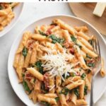 Dish out your creamy tomato and spinach pasta right away to enjoy it at its best—warm, comforting, and utterly delicious. For an optional finishing touch, sprinkle extra Parmesan cheese over the top as a final flourish of flavor.
