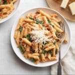 A rich and creamy tomato and spinach pasta that combines tender penne pasta with a flavorful sauce made from crushed tomatoes, fresh spinach, and creamy heavy cream, finished with Parmesan cheese for a comforting and delicious meal perfect for busy weeknights.
