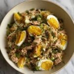 A quick and tasty Tuna Salad featuring canned tuna, hard-boiled eggs, and a creamy blend of mayonnaise and Dijon mustard, flavored with pickles and onions. Perfect for a light lunch or snack, served chilled on toast, in sandwiches, or over greens.
