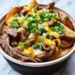 This Crockpot Loaded Steak and Potato Bake is a hearty, flavorful dish perfect for an easy and comforting meal. Tender sirloin steak cubes and diced russet potatoes slow-cooked with onions, garlic, and savory seasonings, then topped with melted cheddar cheese, sour cream, and fresh green onions. A convenient one-pot recipe ideal for busy days.