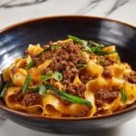 Cumin Lamb Noodles is a flavorful Chinese-inspired stir-fry dish featuring tender lamb shoulder cooked with aromatic cumin and chili flakes, tossed with wide wheat noodles and fresh vegetables. This hearty main course offers a perfect balance of bold spices and fresh herbs, making it an ideal choice for a comforting yet exciting meal.