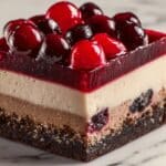 - Add Cherry Topping and Garnish: Carefully spread the entire can of cherry pie filling over the ganache layer. Garnish the top with fresh or maraschino cherries, dollops of whipped cream, and sprinkle with chocolate shavings for an elegant presentation.