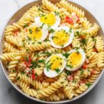 A creamy, tangy Deviled Egg Pasta Salad featuring chopped hard-boiled eggs, tender pasta, and a zesty dressing made with mayonnaise, Dijon mustard, and sweet pickle relish. Perfectly chilled to meld flavors, this salad is a delightful side dish for picnics, potlucks, or casual gatherings.