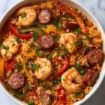This Easy Crockpot Jambalaya recipe is a comforting, flavorful one-pot dish combining tender chicken, spicy Andouille sausage, fresh vegetables, and succulent shrimp slow-cooked to perfection. Paired with fluffy white rice, it’s a hassle-free Southern classic perfect for family meals or gatherings.
