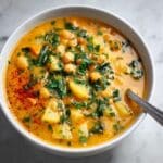 This Easy Garlic Chickpea Soup is a warm, comforting, and flavorful vegetarian dish that combines the hearty goodness of chickpeas and potatoes with aromatic garlic and herbs. Perfect for a quick and healthy meal, this soup is made on the stovetop and features a creamy texture achieved by blending part of the soup to your preference.