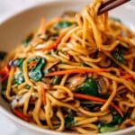 This Easy Lo Mein recipe is a quick and flavorful vegetarian stir-fry noodle dish loaded with fresh vegetables and a savory sauce. Perfect for a weeknight dinner, it combines tender lo mein noodles with crisp bell peppers, carrots, and snow peas, all tossed in a delicious blend of soy, oyster, and hoisin sauces. Ready in just 25 minutes, this homemade lo mein is both satisfying and versatile.