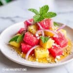 - Add Mint and Feta: Sprinkle the chopped fresh mint leaves and crumbled feta cheese over the fruit and onion mixture to add flavor and texture.