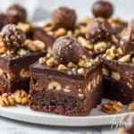 These Ferrero Rocher Fudge Brownies are an ultra-rich and decadent dessert that combines fudgy chocolate brownies with swirls of chocolate hazelnut spread and chopped Ferrero Rocher chocolates for a luxurious treat.