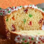 - Glaze and Decorate: Drizzle the glaze evenly over the cooled bread. Optionally, sprinkle additional red and green sprinkles on top for extra festive flair. Let the glaze set before slicing and serving.