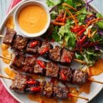 Firecracker Kabobs are a vibrant and flavorful grilled dish featuring juicy marinated chicken thighs skewered with colorful bell peppers, zucchini, and red onion. The marinade combines savory soy sauce, sweet honey, garlic powder, and a spicy kick of red pepper flakes, delivering a perfect balance of heat and sweetness. Ideal for a quick and delicious summer meal, these kabobs are grilled to perfection with juicy, tender chicken and charred vegetables.