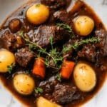 French Beef Bourguignon is a classic French stew featuring tender beef chuck slow-braised in a rich Burgundy wine sauce with aromatic vegetables, mushrooms, and pearl onions. This hearty dish is perfect for a comforting meal, showcasing deep flavors developed through slow oven braising.