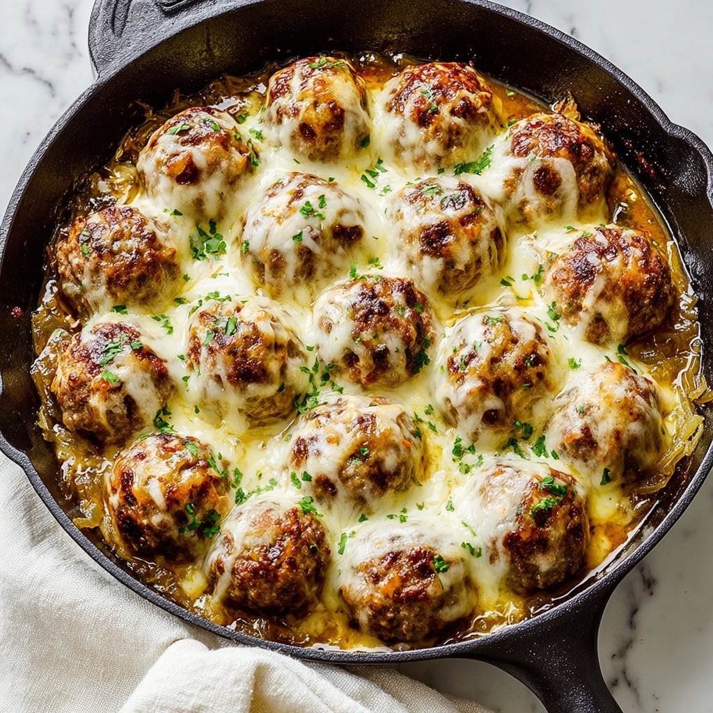 - Combine and Finish: Once the meatballs have finished baking, transfer them into the skillet with the French onion sauce. Sprinkle the remaining 2 cups of shredded Gruyère cheese evenly over the top. Cover the skillet and cook on low heat for about 5 minutes, or until the cheese melts and the meatballs are heated through. Alternatively, you can place the skillet under a broiler for 3-5 minutes to melt and brown the cheese on top.