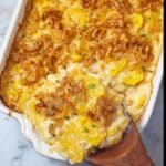 A creamy and savory casserole combining tender yellow squash and onions with French onion dip, cream of mushroom soup, and cheddar cheese, topped with crispy French fried onions for a delightful texture and flavor contrast. Perfect as a comforting side dish or vegetarian main.