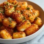 Garlic Parmesan Roasted Potatoes are crispy, golden-brown baby potatoes tossed in a flavorful blend of olive oil, garlic, oregano, and topped with melted Parmesan cheese and fresh parsley. This easy-to-make side dish pairs perfectly with any meal, delivering a savory, cheesy, and herbaceous taste in every bite.