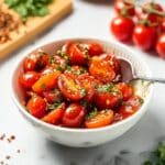 This Garlic Roasted Cherry Tomatoes recipe features sweet cherry tomatoes roasted to perfection with minced garlic, olive oil, and seasoning. The roasting process intensifies the natural sweetness while adding a subtle caramelized flair. Ideal as a side dish, topping for bruschettas, or pasta complement, this simple yet flavorful dish can be enhanced with fresh basil for an aromatic touch.