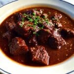 German Goulash (Rindergulasch) is a rich and hearty beef stew featuring tender chunks of beef simmered slowly with onions, garlic, paprika, and a savory broth. This traditional German comfort food is thick and robust, perfect for cold weather, and is typically served over spaetzle, egg noodles, or potatoes. The stew develops deep, satisfying flavors that only improve when made ahead.