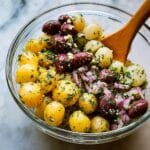 A refreshing Greek Olive Potato Salad featuring tender Yukon Gold potatoes, briny Kalamata olives, crisp red onions, and fresh parsley, all tossed in a zesty lemon and extra virgin olive oil dressing. Perfect as a light side dish or a flavorful addition to your Mediterranean meals, this salad is easy to prepare and served chilled.