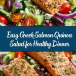 A vibrant and healthy Greek Salmon Quinoa Salad featuring flaky oven-baked salmon, protein-rich quinoa, fresh vegetables, Kalamata olives, and tangy feta cheese, all tossed in a zesty lemon-olive oil dressing. Perfect for a nutritious lunch or light dinner.