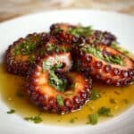 A delicious Mediterranean grilled octopus recipe featuring tenderized octopus boiled with aromatic herbs and then charred to perfection on the grill, finished with a flavorful marinade and fresh parsley garnish.