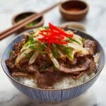 Gyudon, a classic Japanese beef rice bowl, features thinly sliced ribeye simmered with onions in a savory-sweet dashi-based sauce, served over fluffy Japanese short-grain rice and garnished with pickled red ginger. This quick 20-minute recipe captures the comforting flavors of Japan’s popular fast-food staple.